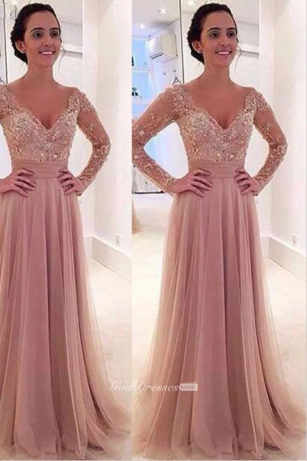 A-Line Satin V-neck Long Sleeve Illusion Low-V Back Dress