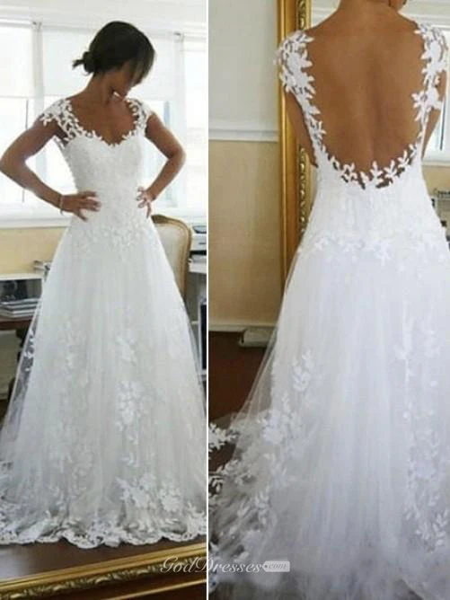 A-line Scoop Applique Chapel Train Lace Wedding Dress