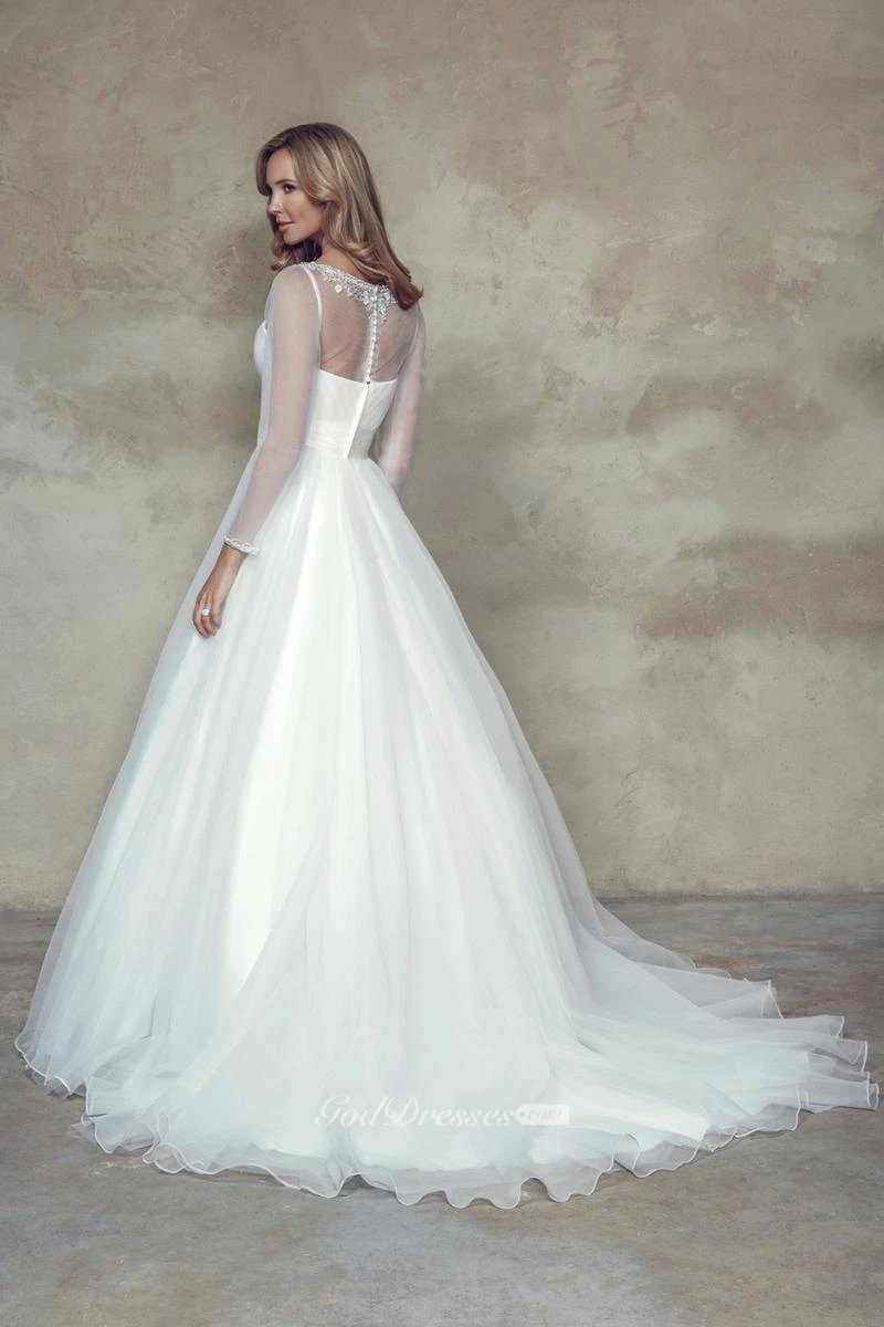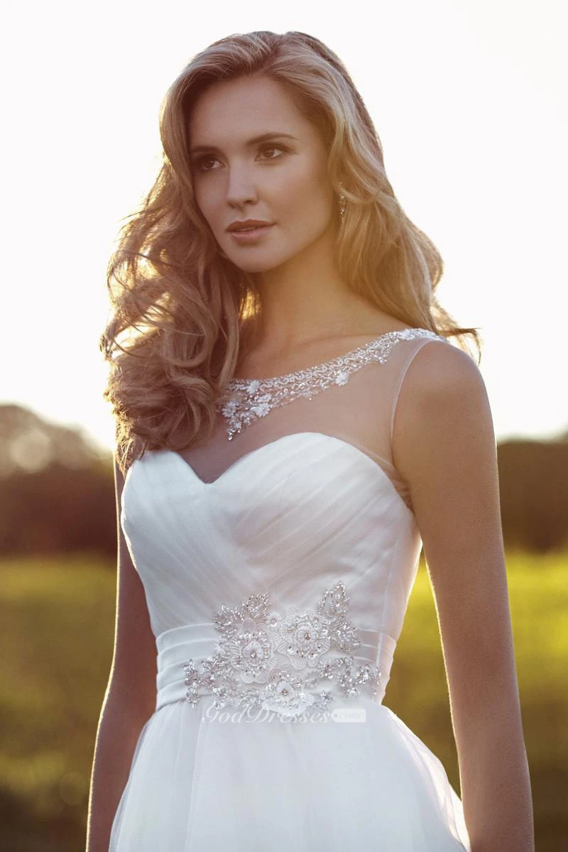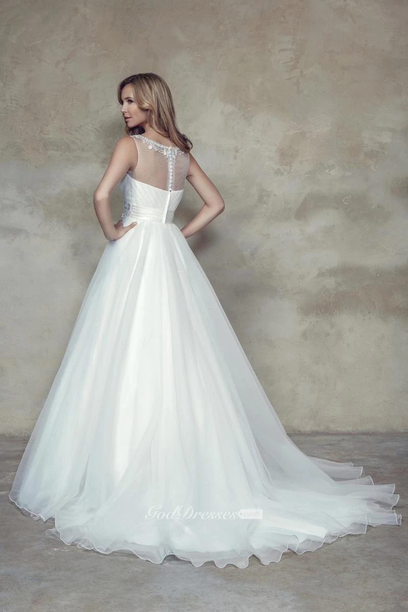 A-Line Scoop Criss-Cross Sleeveless Maxi Tulle&Satin Wedding Dress With Beading And Flower