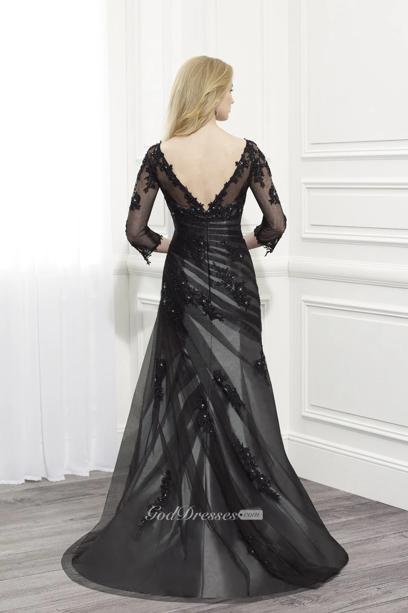 A-Line Scoop-Neck Appliqued Floor-Length 3-4-Sleeve Tulle&Satin Formal Dress With Beading And Side Draping