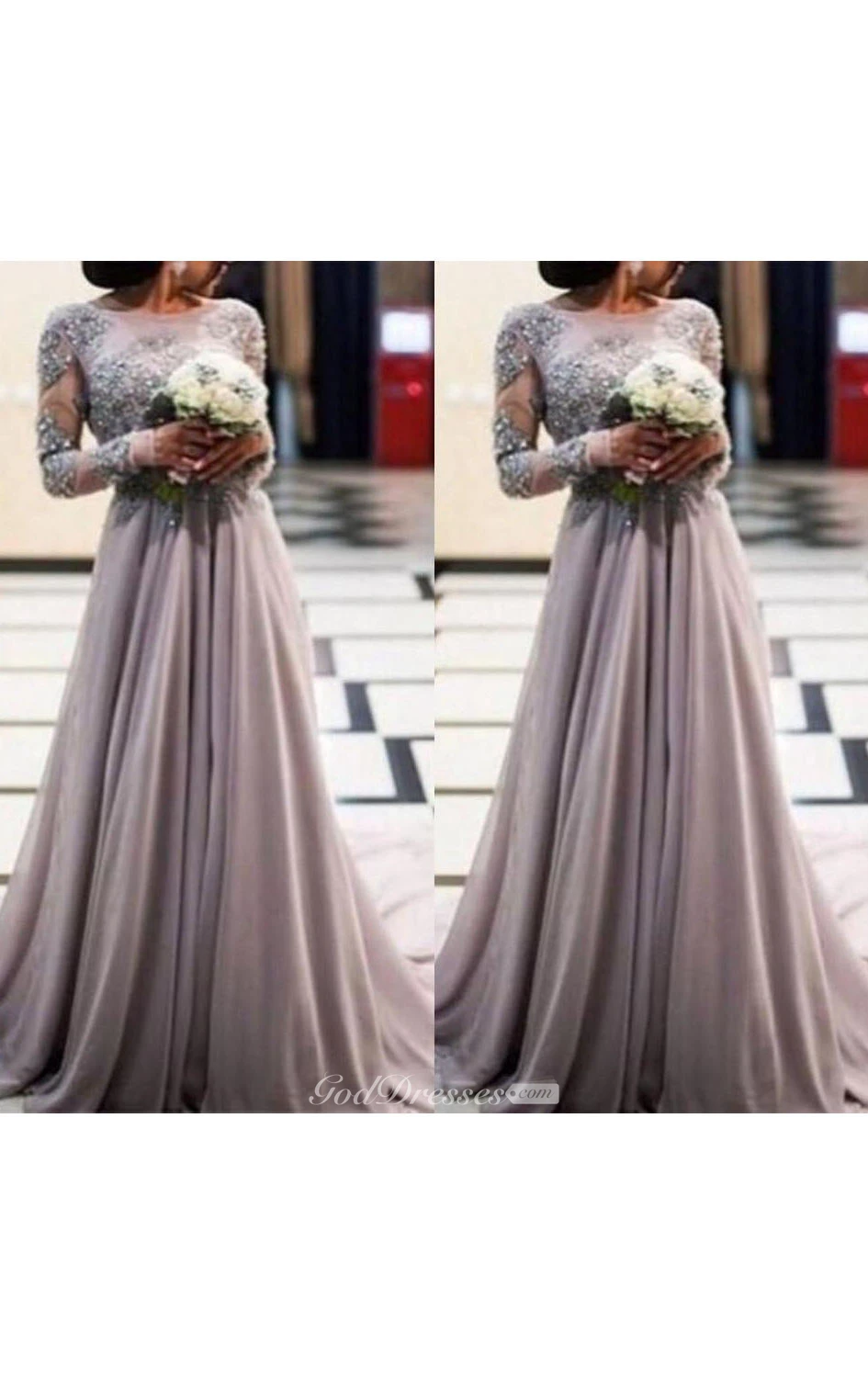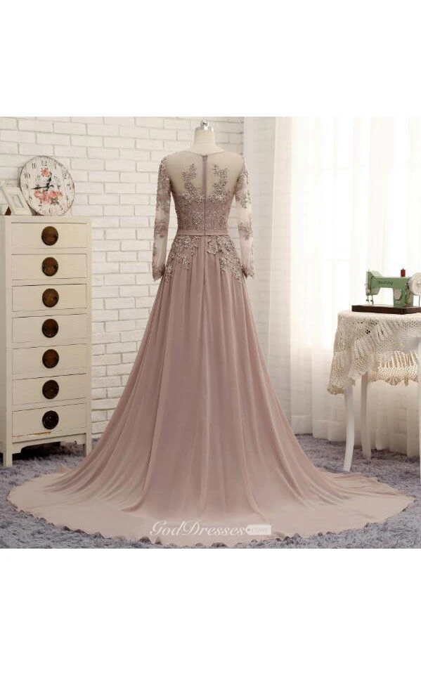 A-line Scoop Neck Long Sleeved Appliqued Chiffon Dress