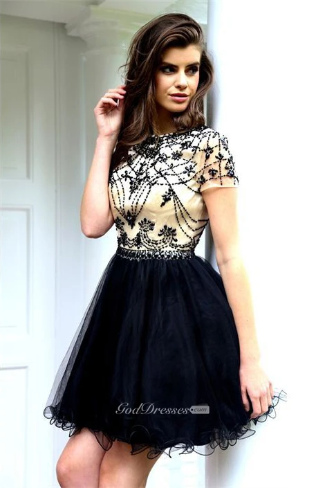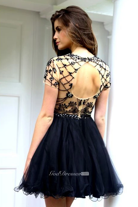 A-Line Scoop Short-Sleeve Beaded Short Prom Dress With Keyhole Back And Ruffles