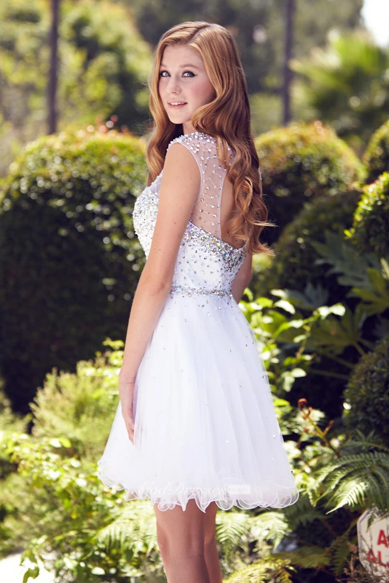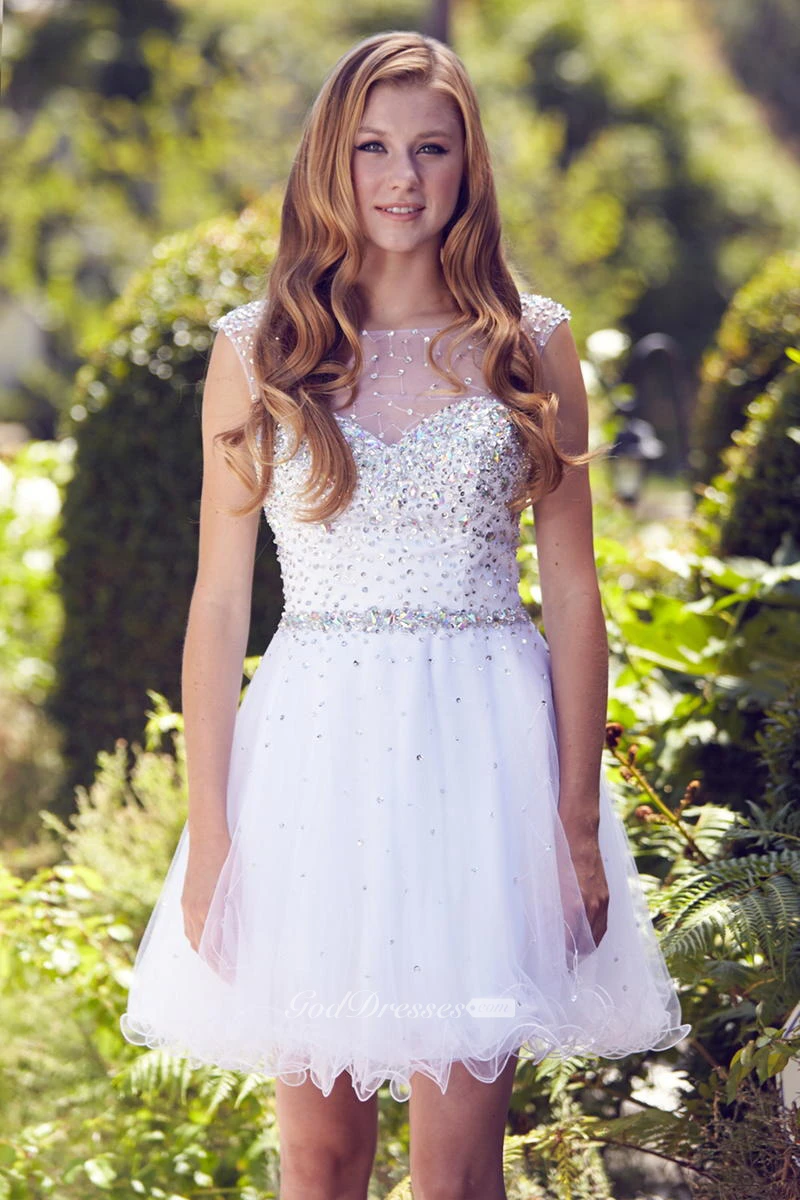 A-Line Short Bateau Cap-Sleeve Tulle Keyhole Dress With Beading