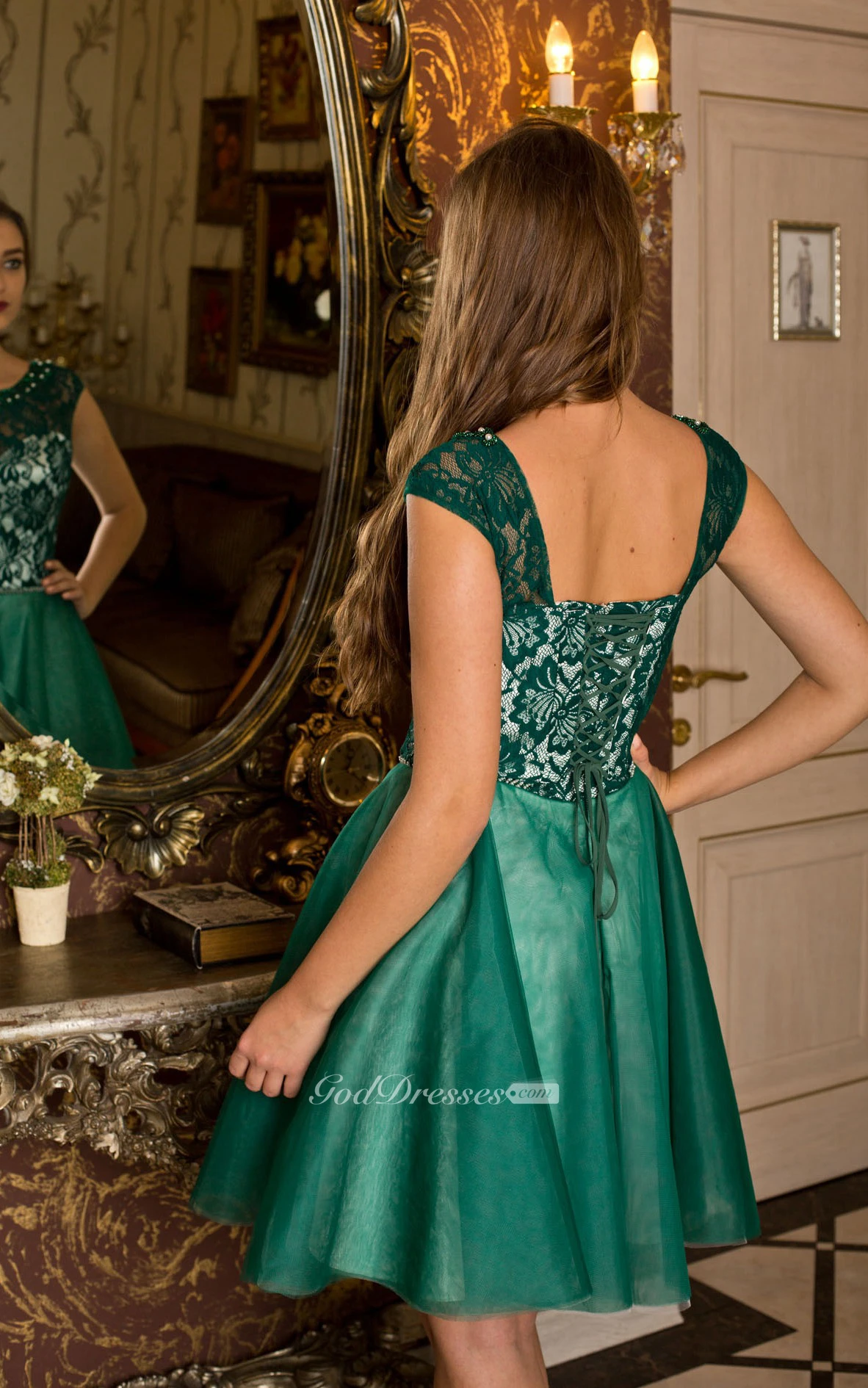 A-Line Short Bateau Short Sleeve Tulle Lace Lace-Up Dress