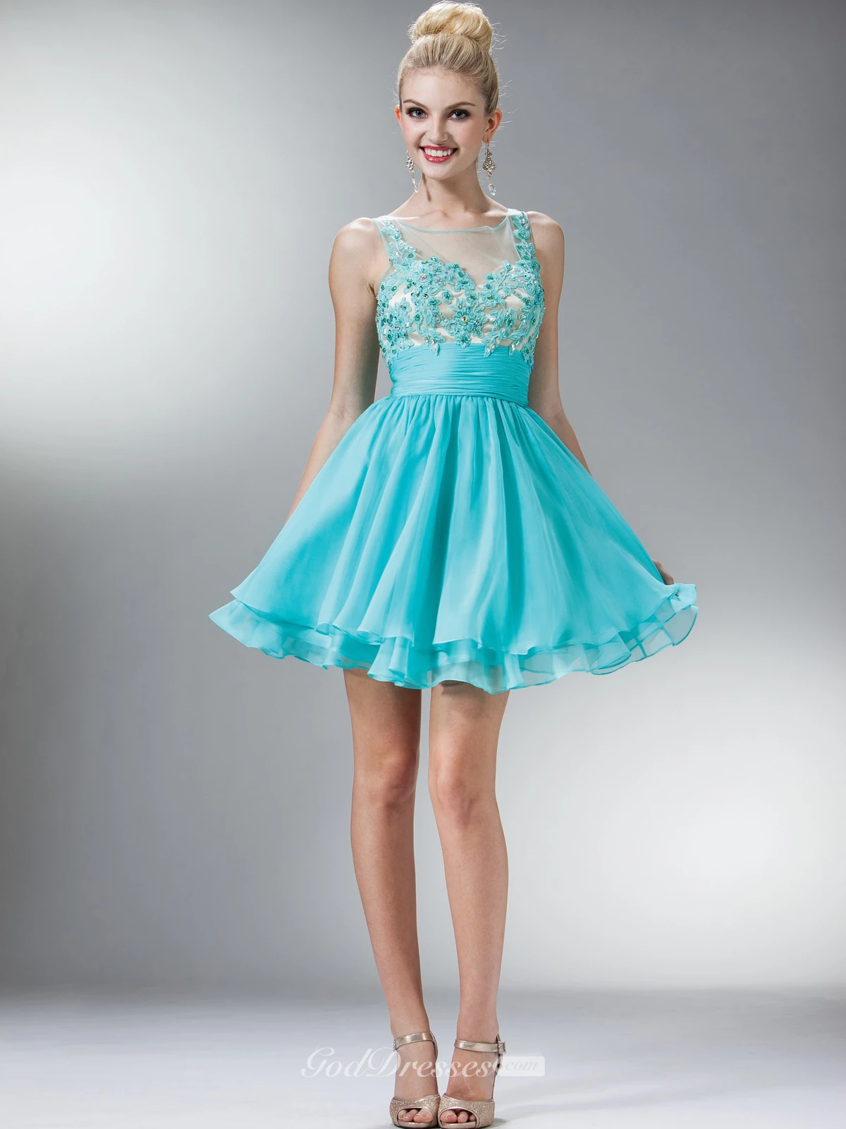 A-Line Short Bateau Sleeveless Chiffon Dress With Appliques And Tiers