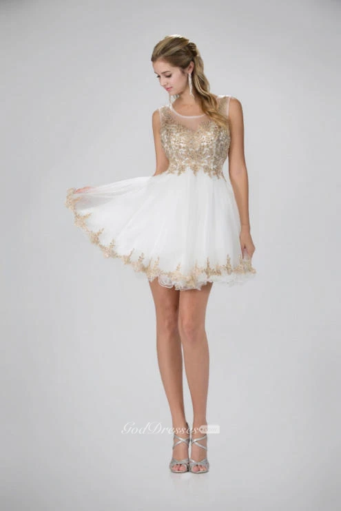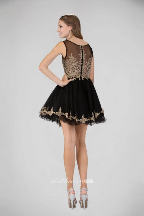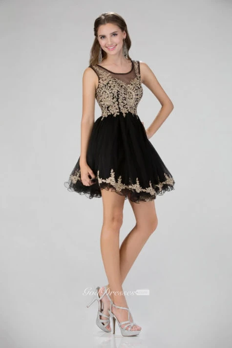 A-Line Short Bateau Sleeveless Illusion Dress With Appliques