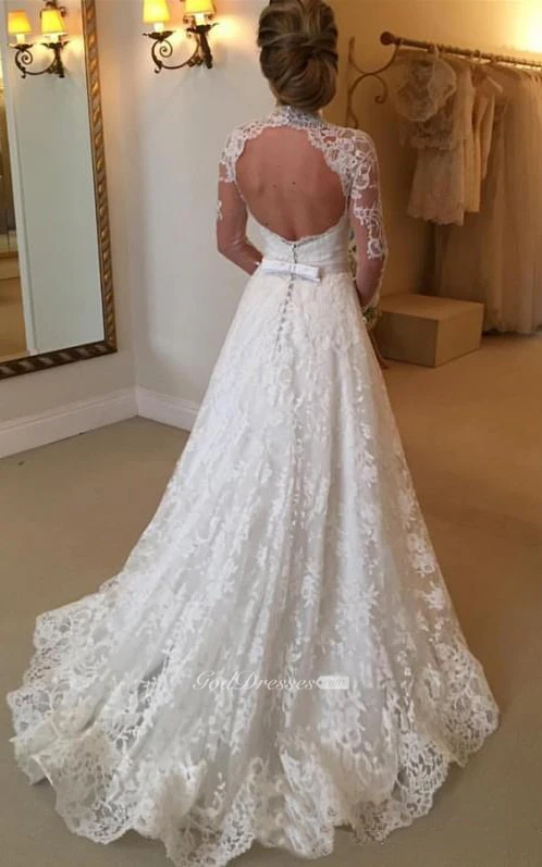 A-Line Short High Neck Long Sleeve Bell Illusion Bow Appliques Tiers Illusion Sweep Train Backless Illusion Lace Dress