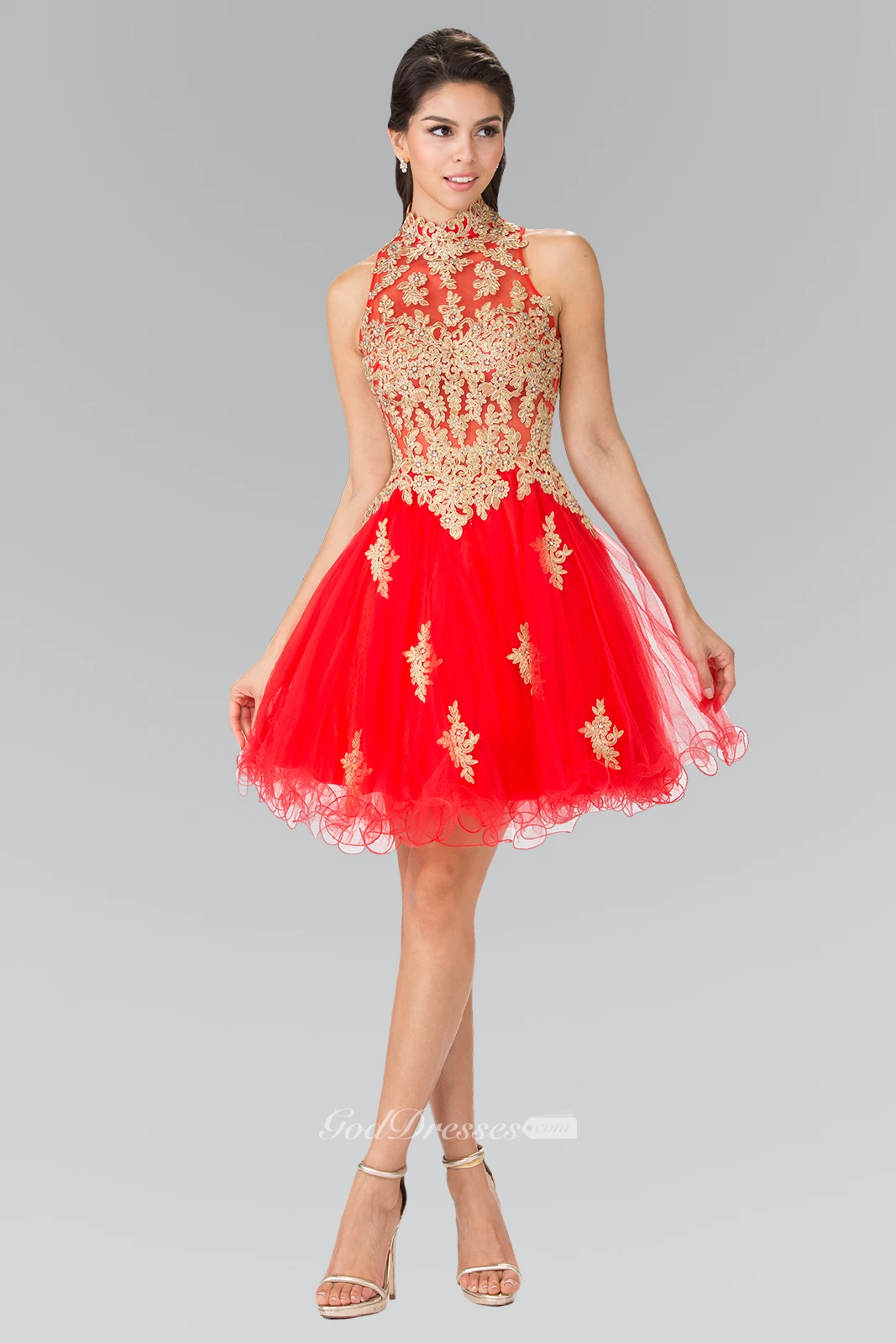 A-Line Short High Neck Sleeveless Tulle Keyhole Dress With Ruffles And Appliques