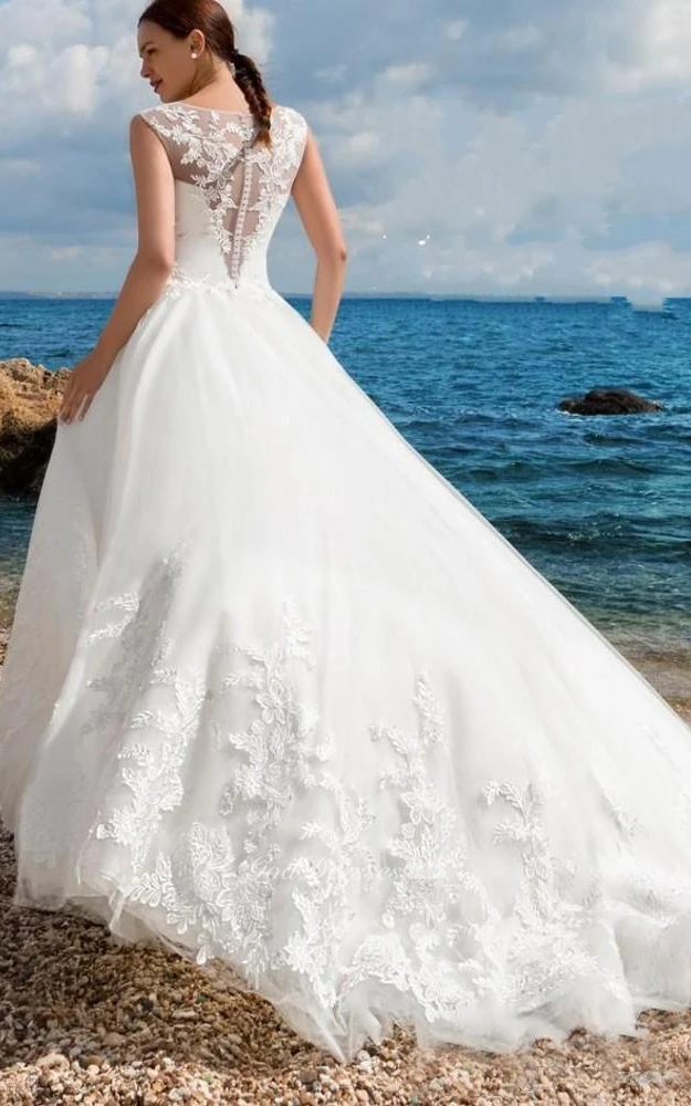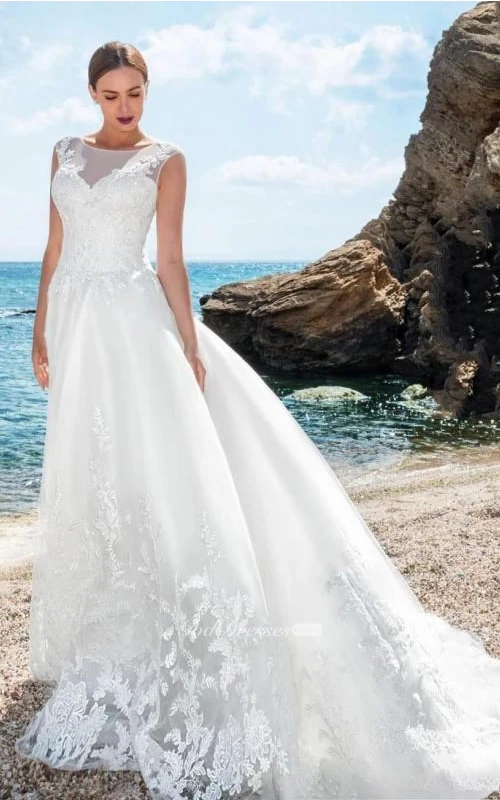A-Line Short Jewel Bell Cap Appliques Sweep Train Button Zipper Lace Dress