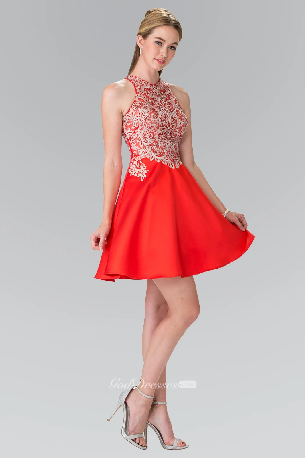 A-Line Short Jewel-Neck Sleeveless Satin Dress With Appliques And Beading