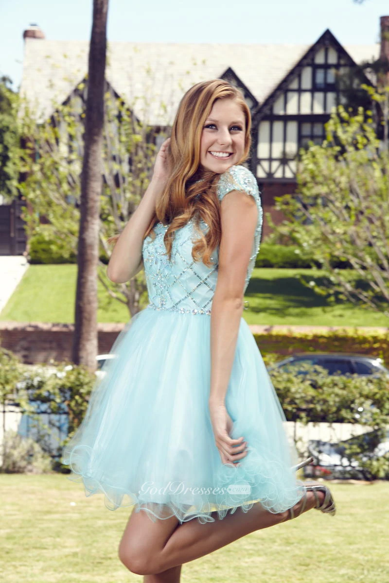A-Line Short Jewel-Neck Sleeveless Tulle Satin Dress With Beading