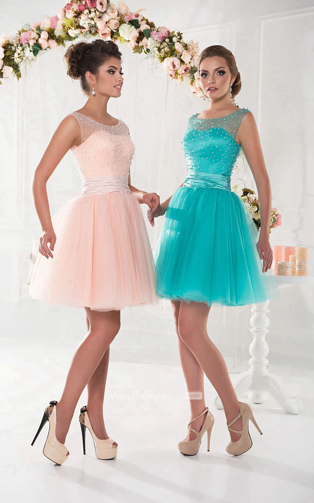 A-Line Short Jewel Sleeveless Tulle Beading Pleats Lace-Up Dress