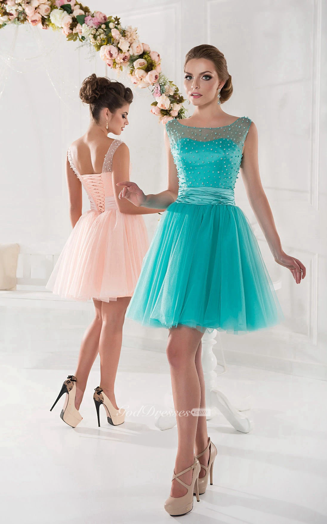 A-Line Short Jewel Sleeveless Tulle Pleats Lace-Up Dress