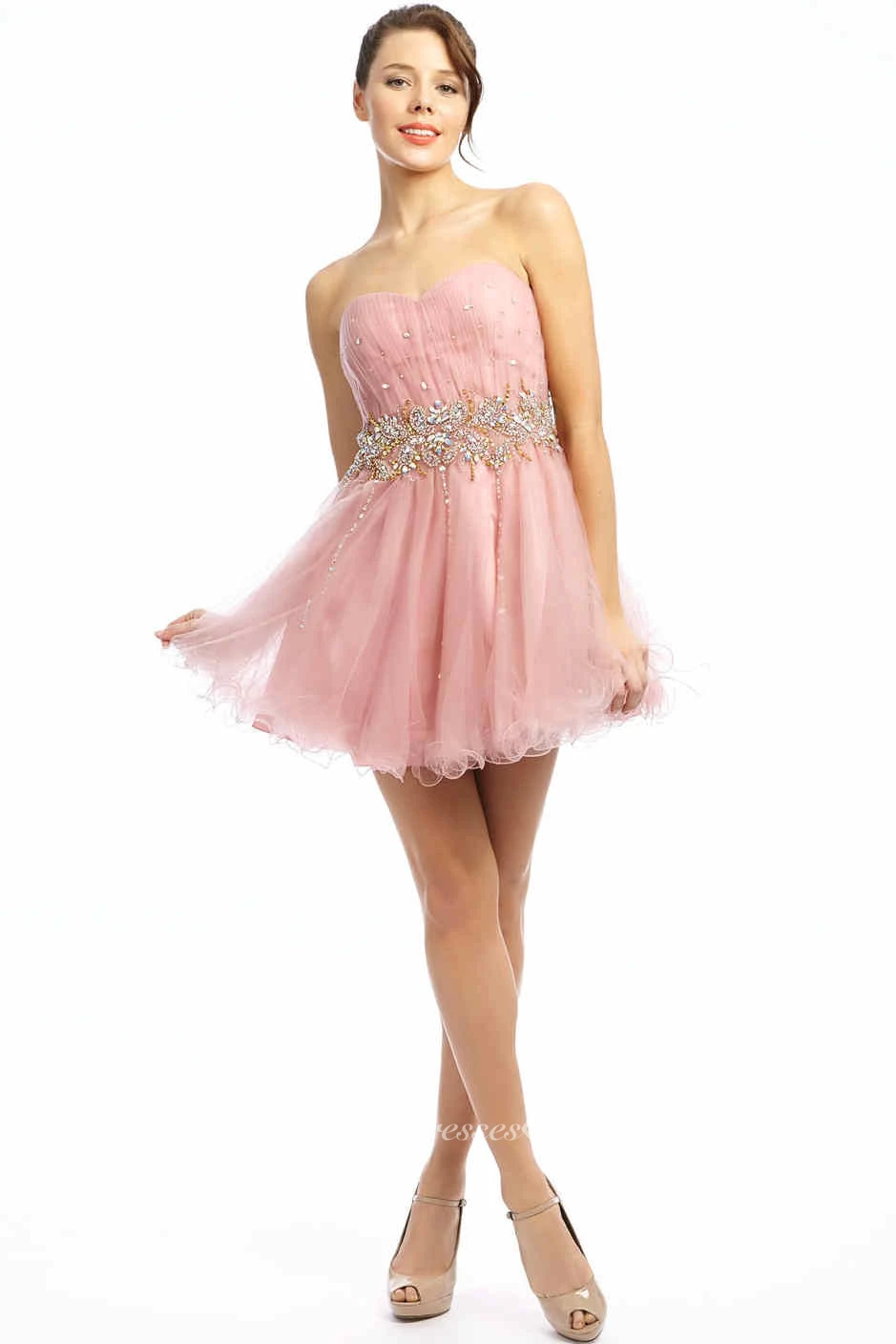 A Line Short Mini Sweetheart Sleeveless Beaded Tulle Prom Dress With Ruffles