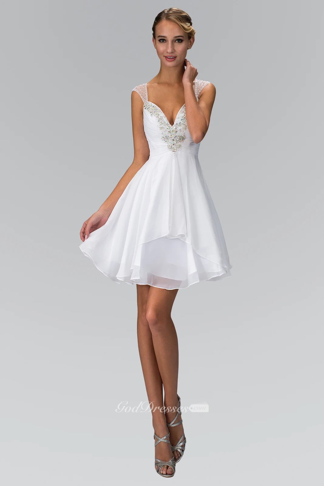 A-Line Short Queen Anne Sleeveless Chiffon Dress With Ruching And Beading