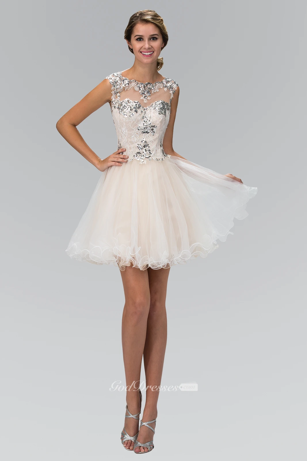 A-Line Short Scoop-Neck Cap-Sleeve Tulle Dress With Lace And Sequins