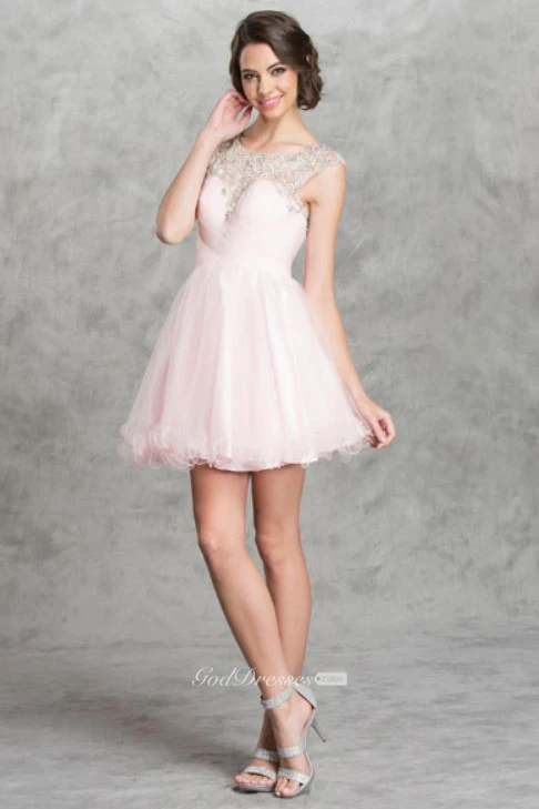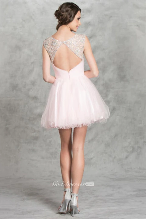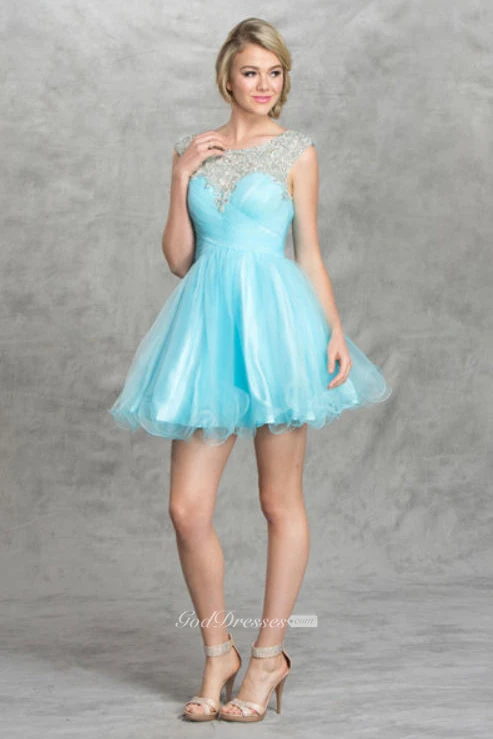 A-Line Short Scoop-Neck Cap-Sleeve Tulle Keyhole Dress With Beading And Criss Cross