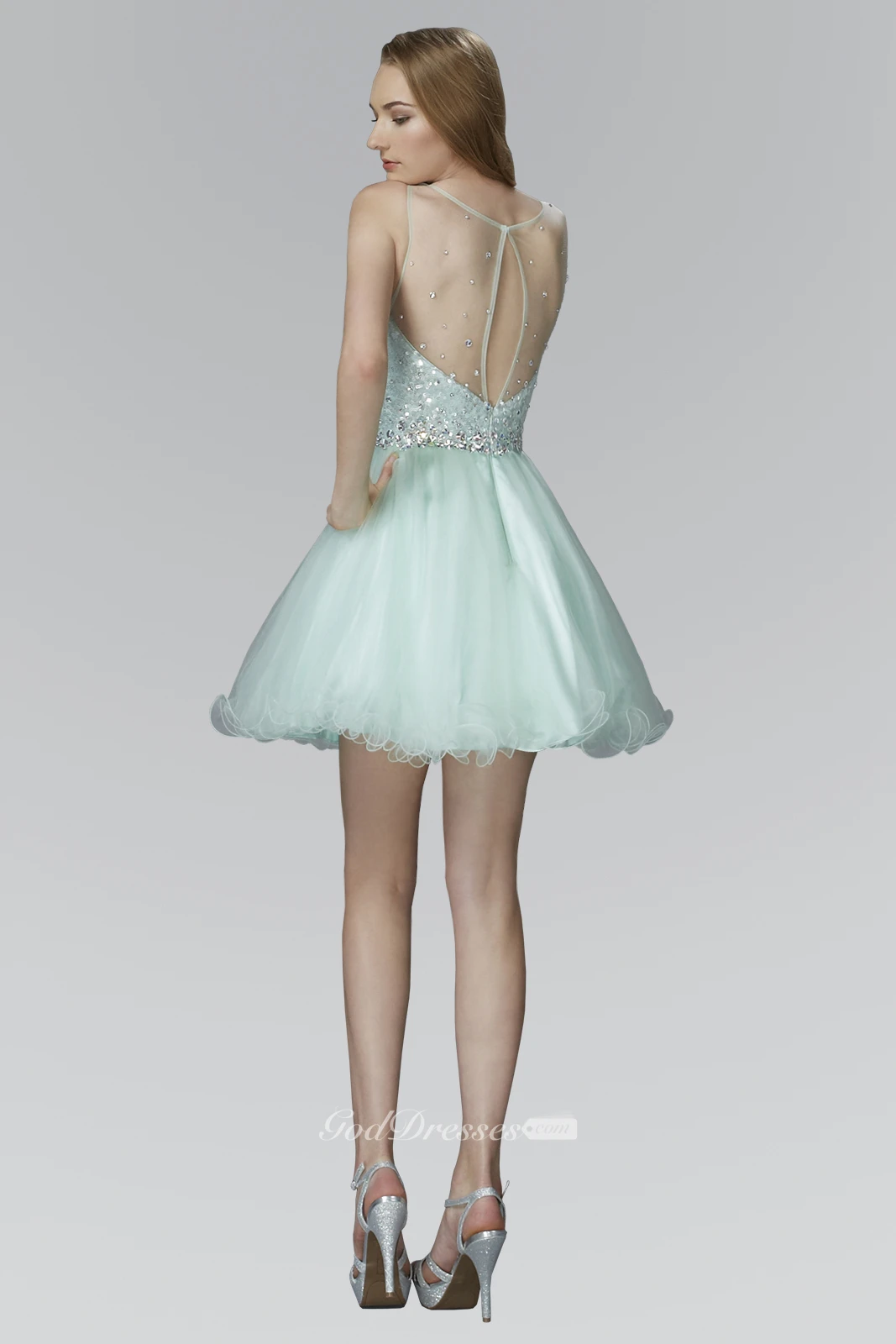 A-Line Short Scoop-Neck Sleeveless Tulle Illusion Dress With Sequins And Ruffles
