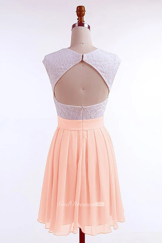 A-line Short Sleeve Chiffon Lace Bateau Keyhole Short Mini Homecoming Dress