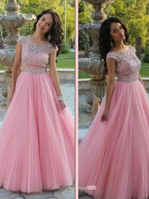 A-line Short Sleeves Scoop Beading Tulle Floor-Length Dresses