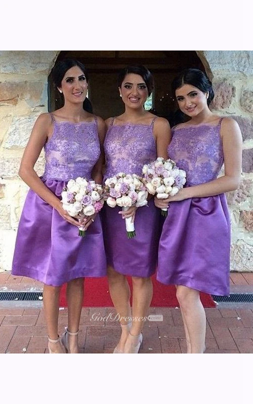 A-line Short Spaghetti Square Straps Sleeveless Lace Satin Dress