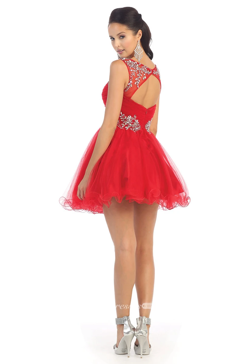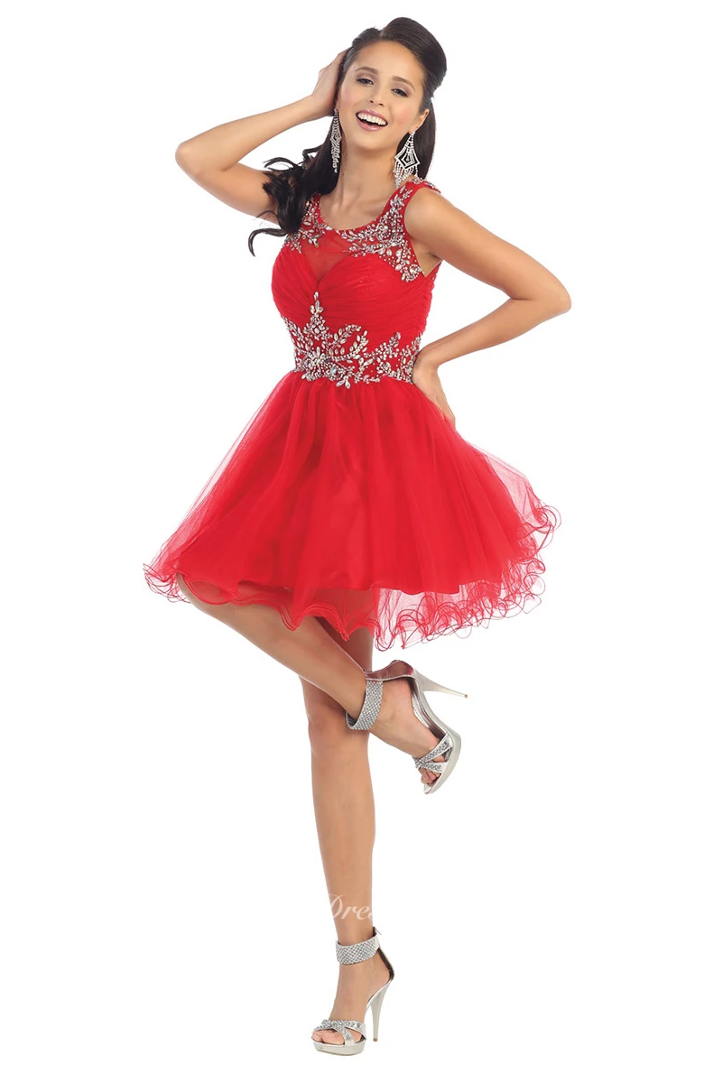 A-Line Short Square-Neck Sleeveless Tulle Keyhole Dress With Ruffles And Beading