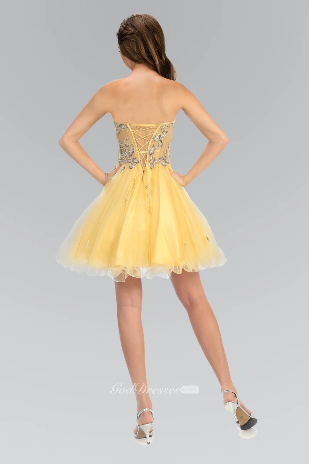 A-Line Short Strapless Sleeveless Tulle Satin Dress With Beading And Pleats