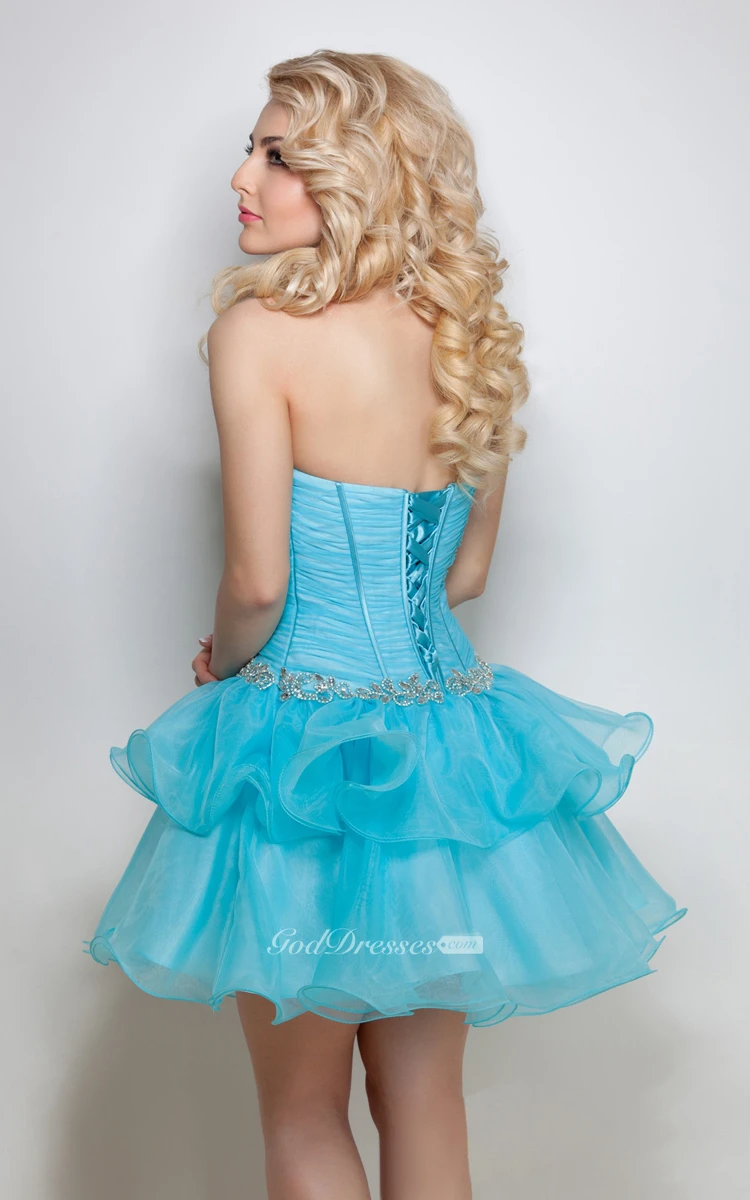 A-Line Short Sweetheart Sleeveless Tulle Beading Ruffles Low-V Back Dress