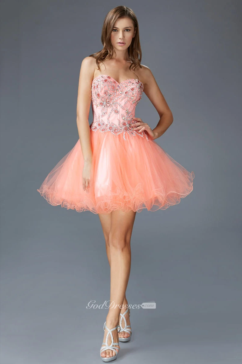 A-Line Short Sweetheart Sleeveless Tulle Satin Corset Back Dress With Beading