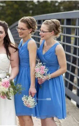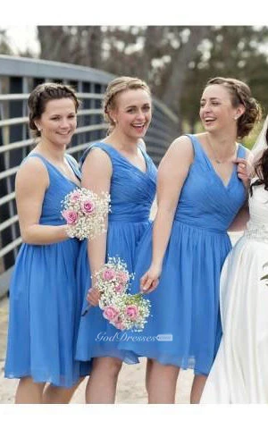 A-line Short V-neck Sleeveless Draping Zipper Chiffon Dress
