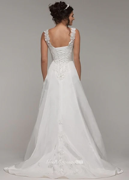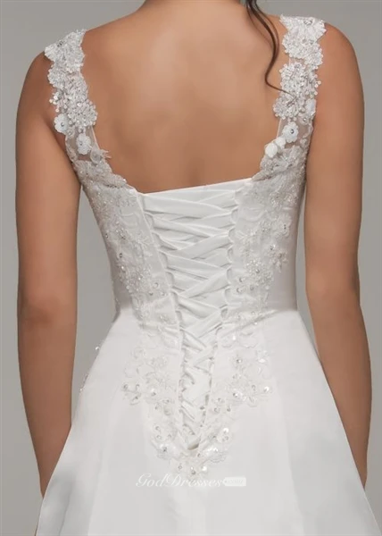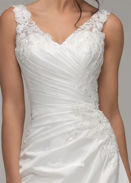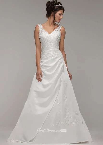A-Line Side-Draped Floor-Length V-Neck Sleeveless Stretched Satin Wedding Dress With Appliques