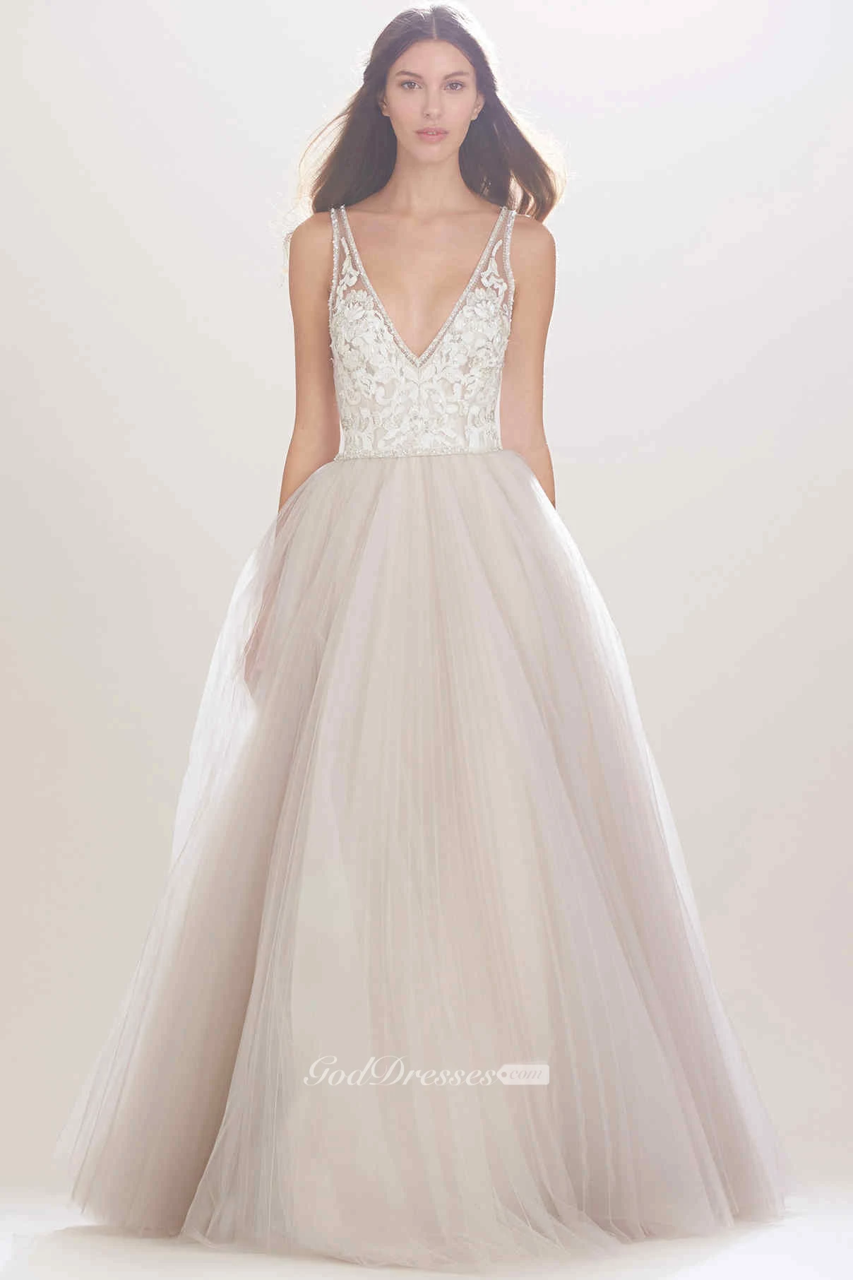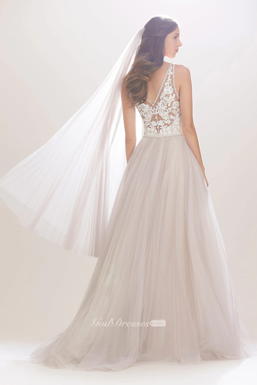 A-Line Sleeveless Appliqued V-Neck Tulle Wedding Dress With Beading And Illusion