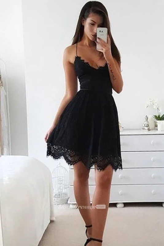 A-line Sleeveless Lace Spaghetti V-neck Open Back Tied Back Short Mini Homecoming Dress