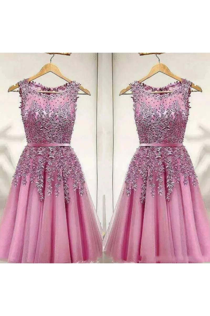 A-line Sleeveless Lace Tulle Bateau Knee-length Homecoming Dress