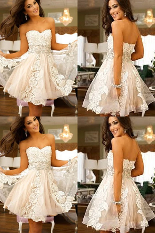 A-line Sleeveless Lace Tulle Sweetheart Open Back Zipper Short Mini Homecoming Dress