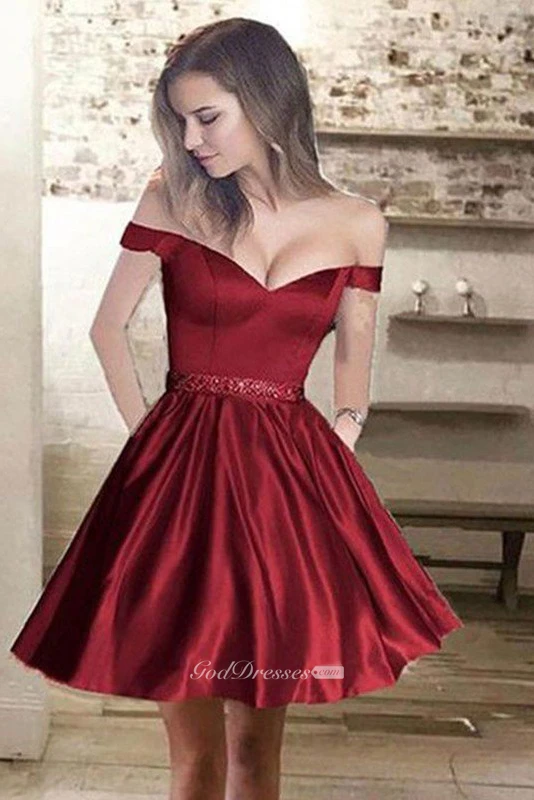 A-line Sleeveless Satin Off-the-shoulder Short Mini Homecoming Dress