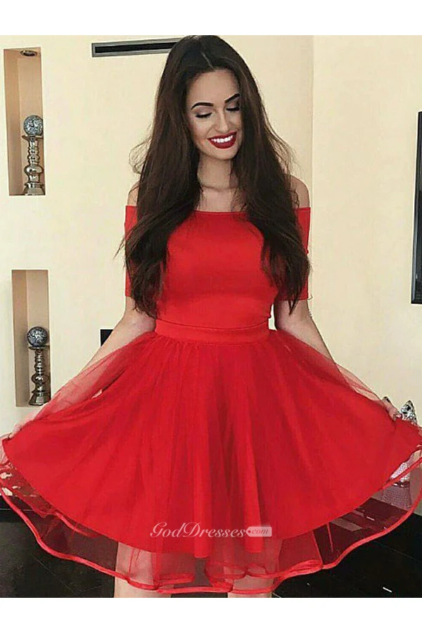 A-line Sleeveless Satin Tulle Off-the-shoulder Short Mini Homecoming Dress