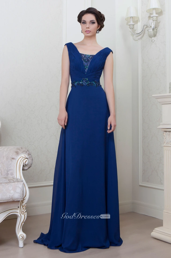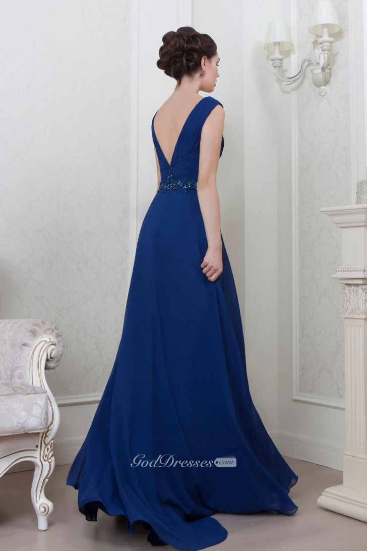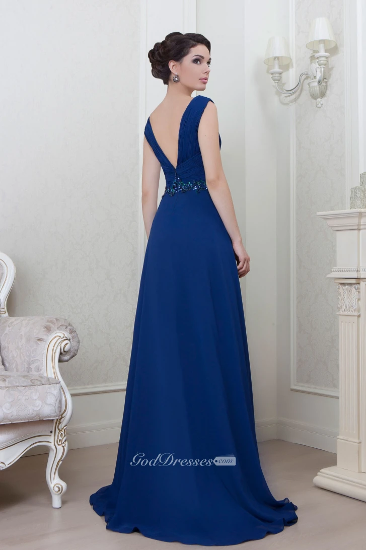 A-Line Sleeveless V-Neck Floor-Length Ruched Chiffon Evening Dress With Beading