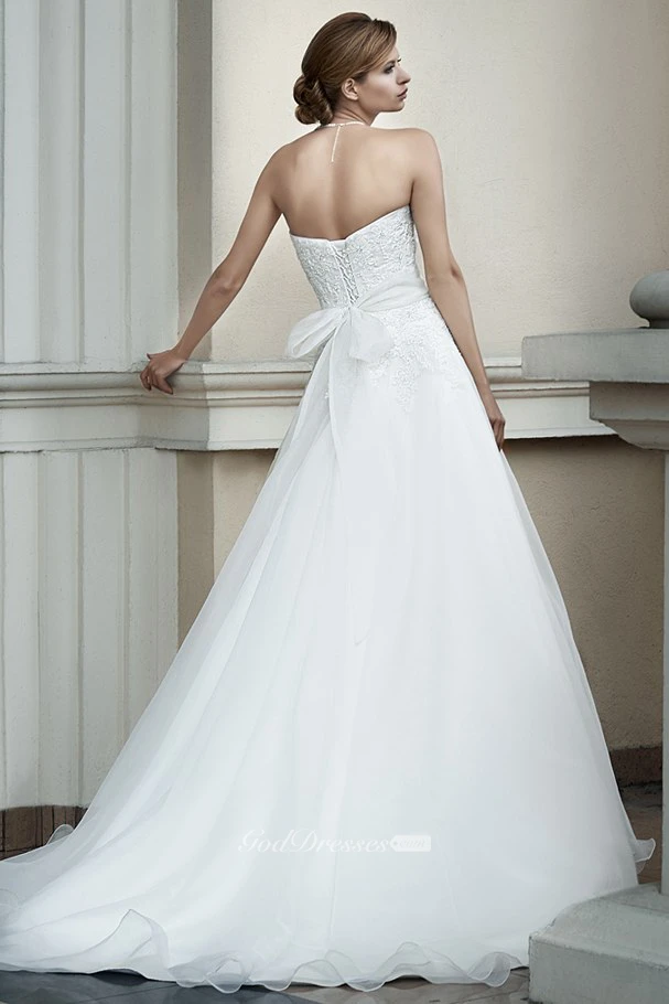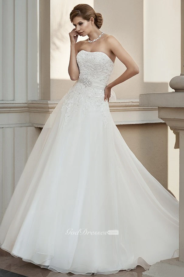 A-Line Strapless Floor-Length Appliqued Sleeveless Lace&Organza Wedding Dress With Bow
