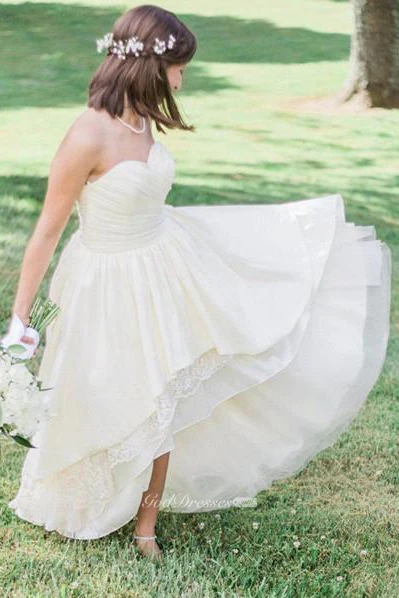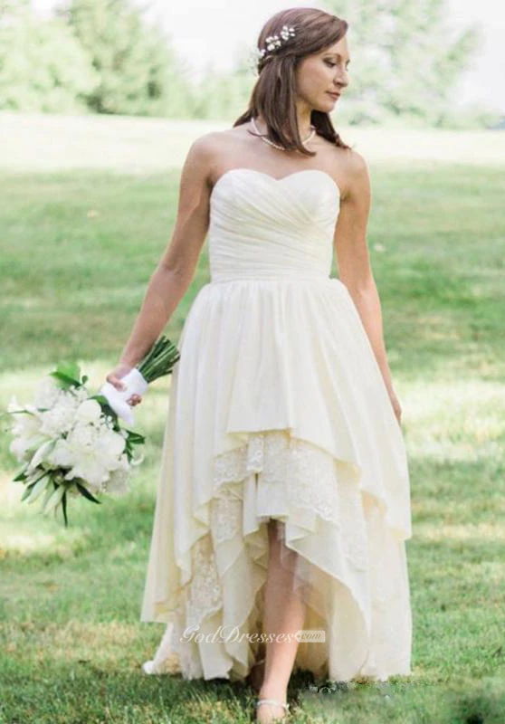 A Line Strapless High Low Lace Chiffon Backless Tiered Wedding Gown