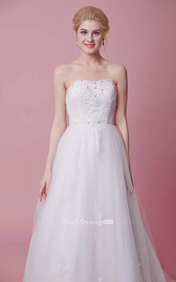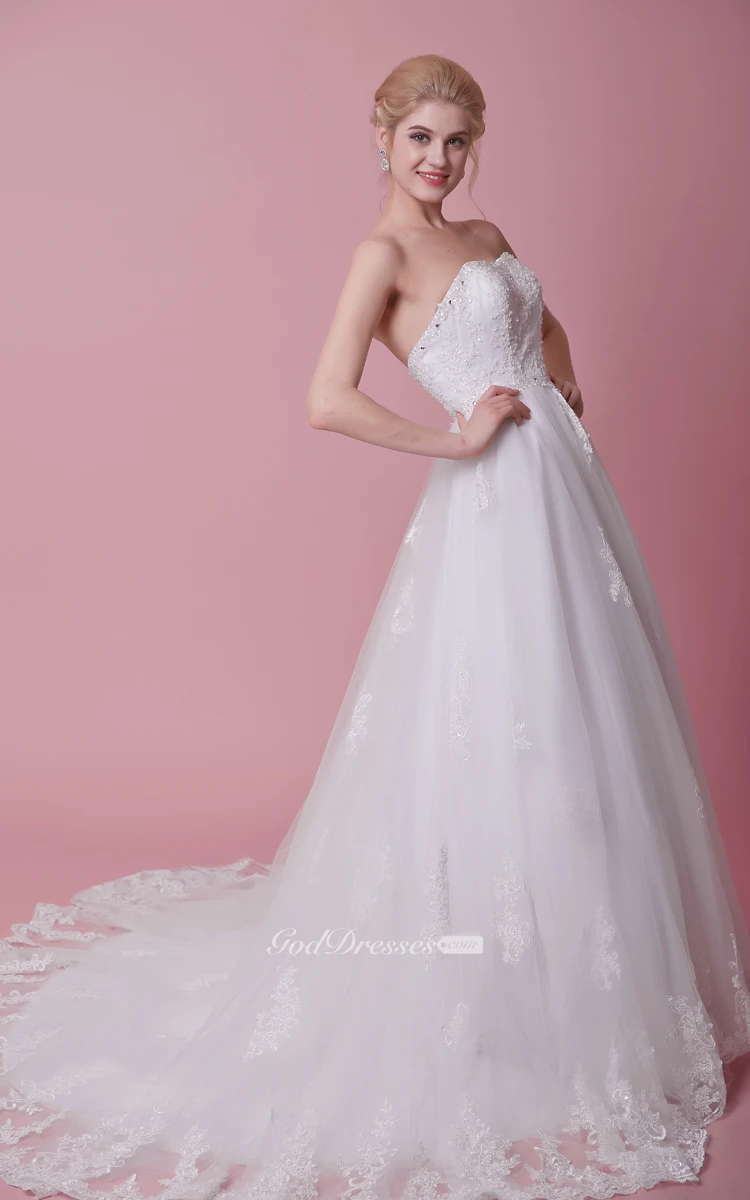 A-Line Strapless Lace-Appliqued Tulle Dress With Beaded Bodice