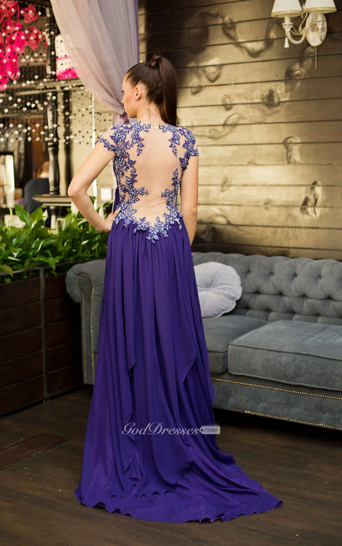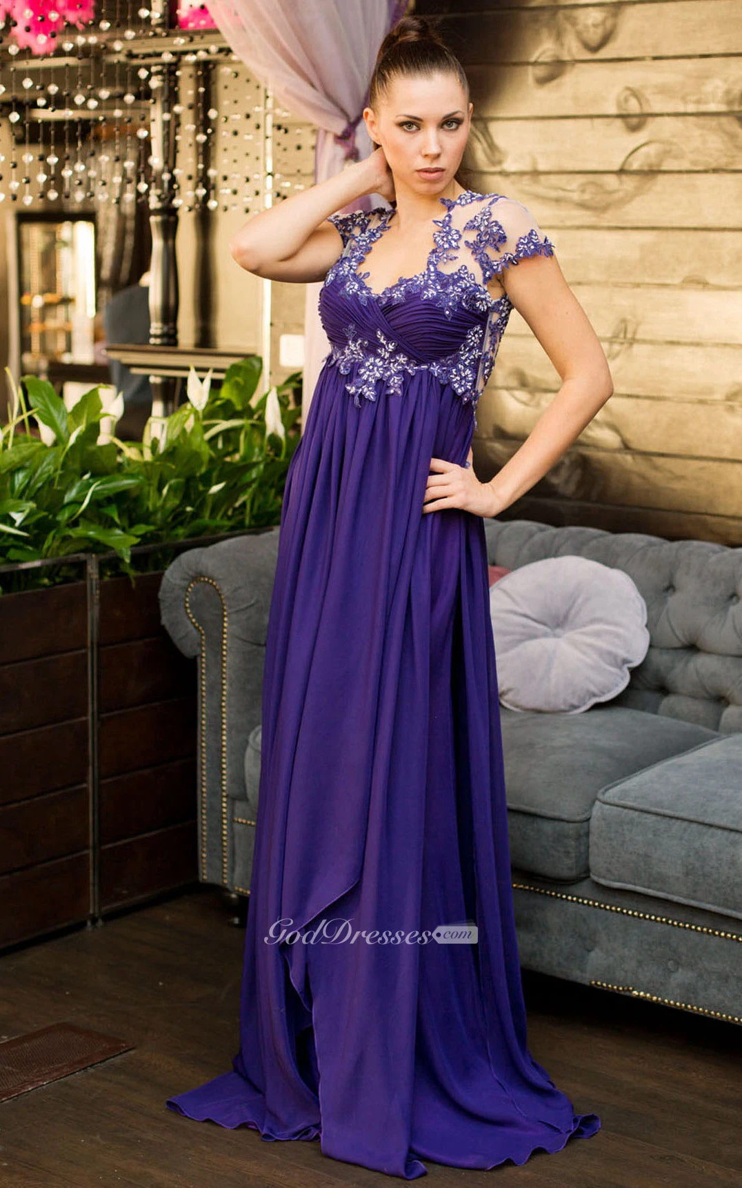 A-Line Sweep Queen Anne Short Sleeve Jersey Appliques Pleats Illusion Dress