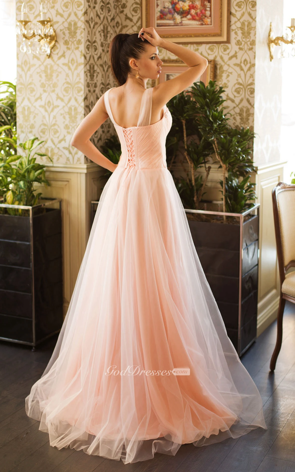 A-Line Sweep V-Neck Sleeveless Tulle Beading Pleats Lace-Up Dress