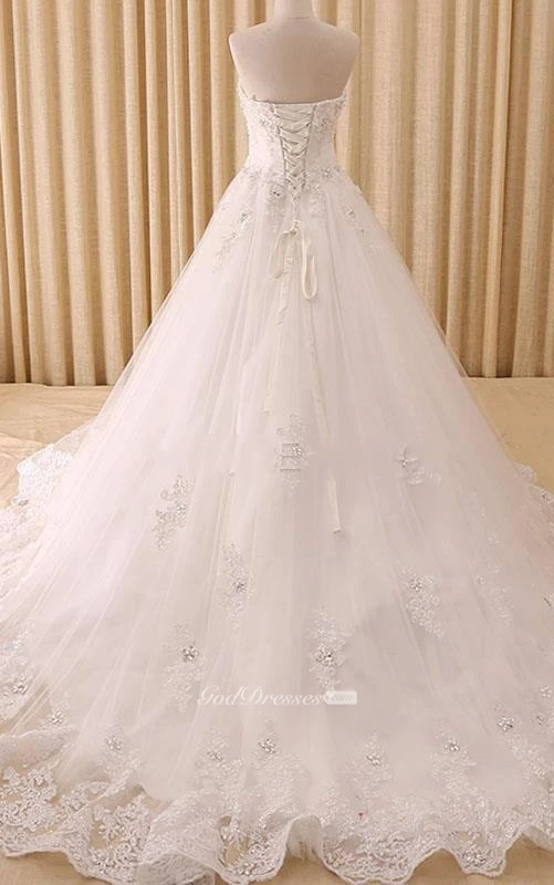 A-Line Sweetheart Bell Pleats Beading Appliques Court Train Zipper Lace-Up Back Chiffon Tulle Lace Sequins Organza Satin Taffeta Dress