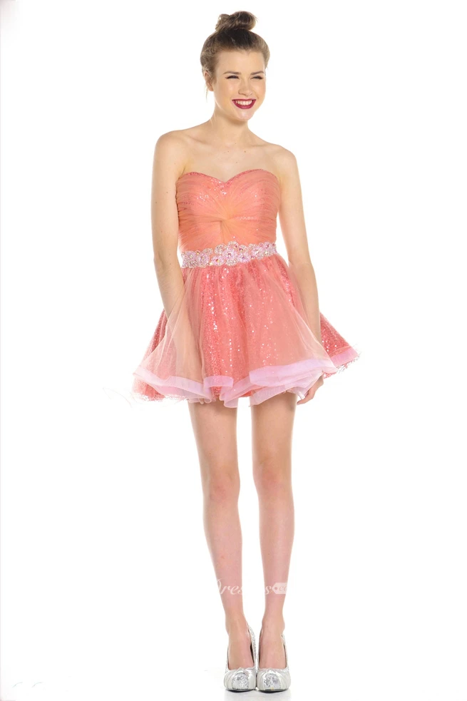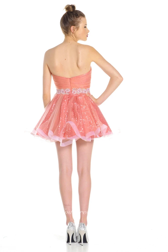 A Line Sweetheart Ruched Sleeveless Short Mini Sequins&Tulle Prom Dress With Waist Jewellery