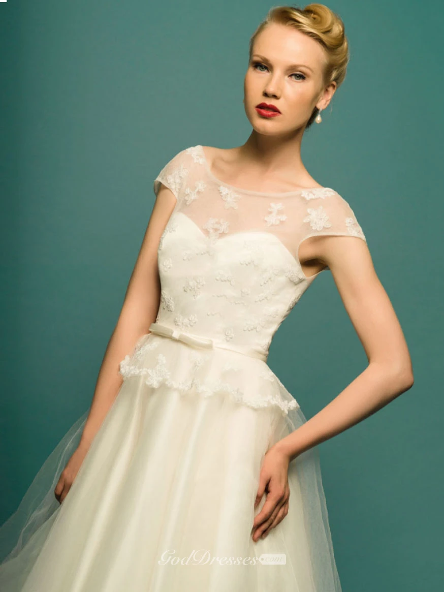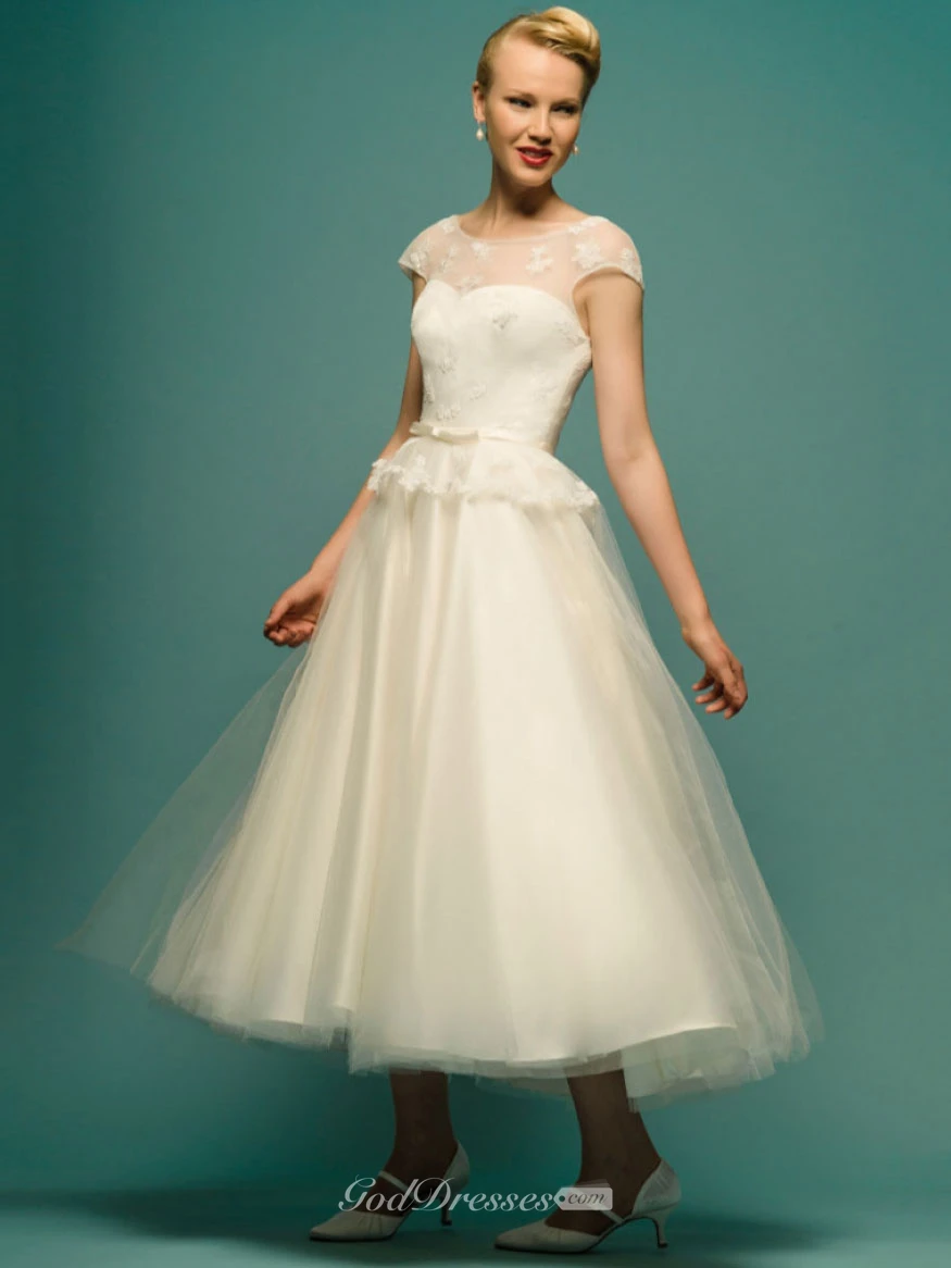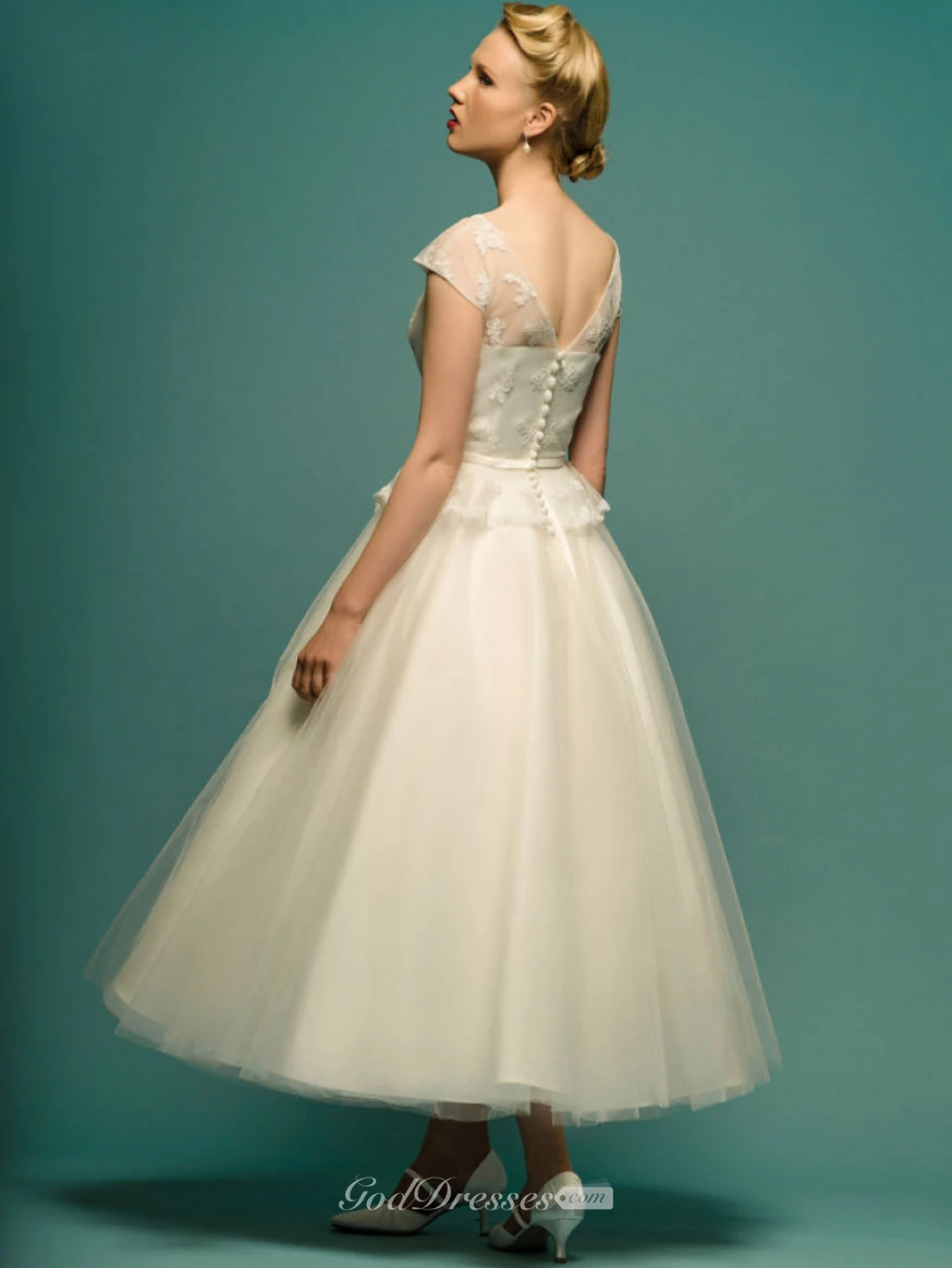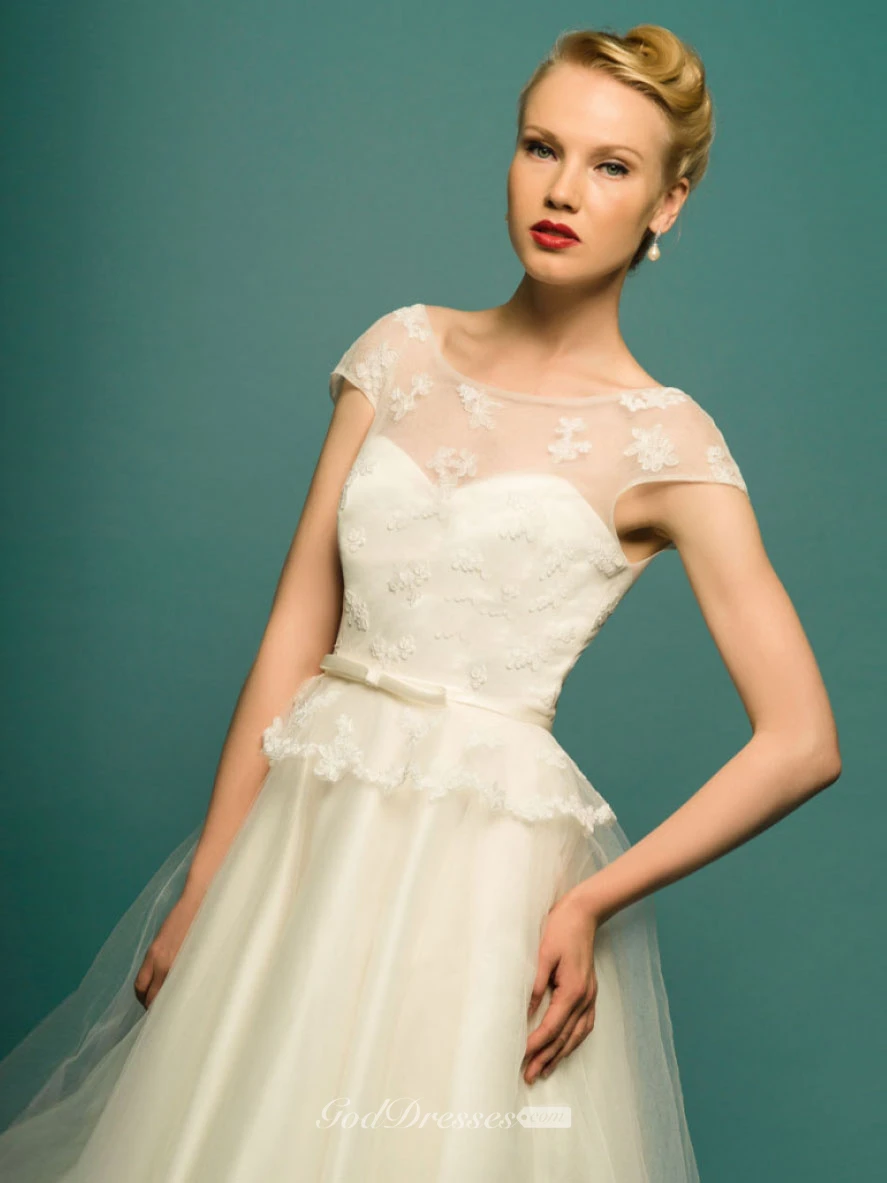 A-Line Tea-Length Appliqued Scoop Neck Cap Sleeve Tulle Wedding Dress