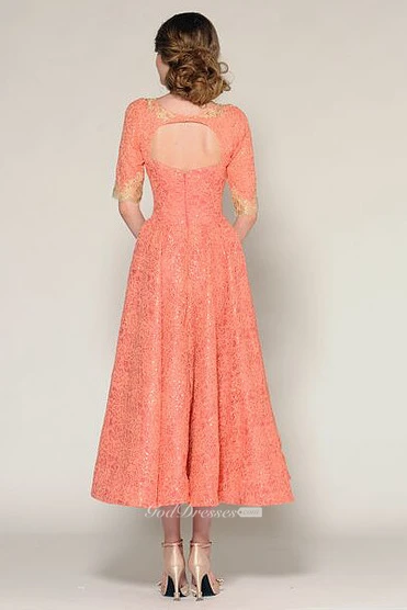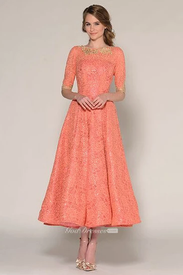 A-Line Tea-Length Half Sleeve Jewel Neck Beaded Lace Prom Dress