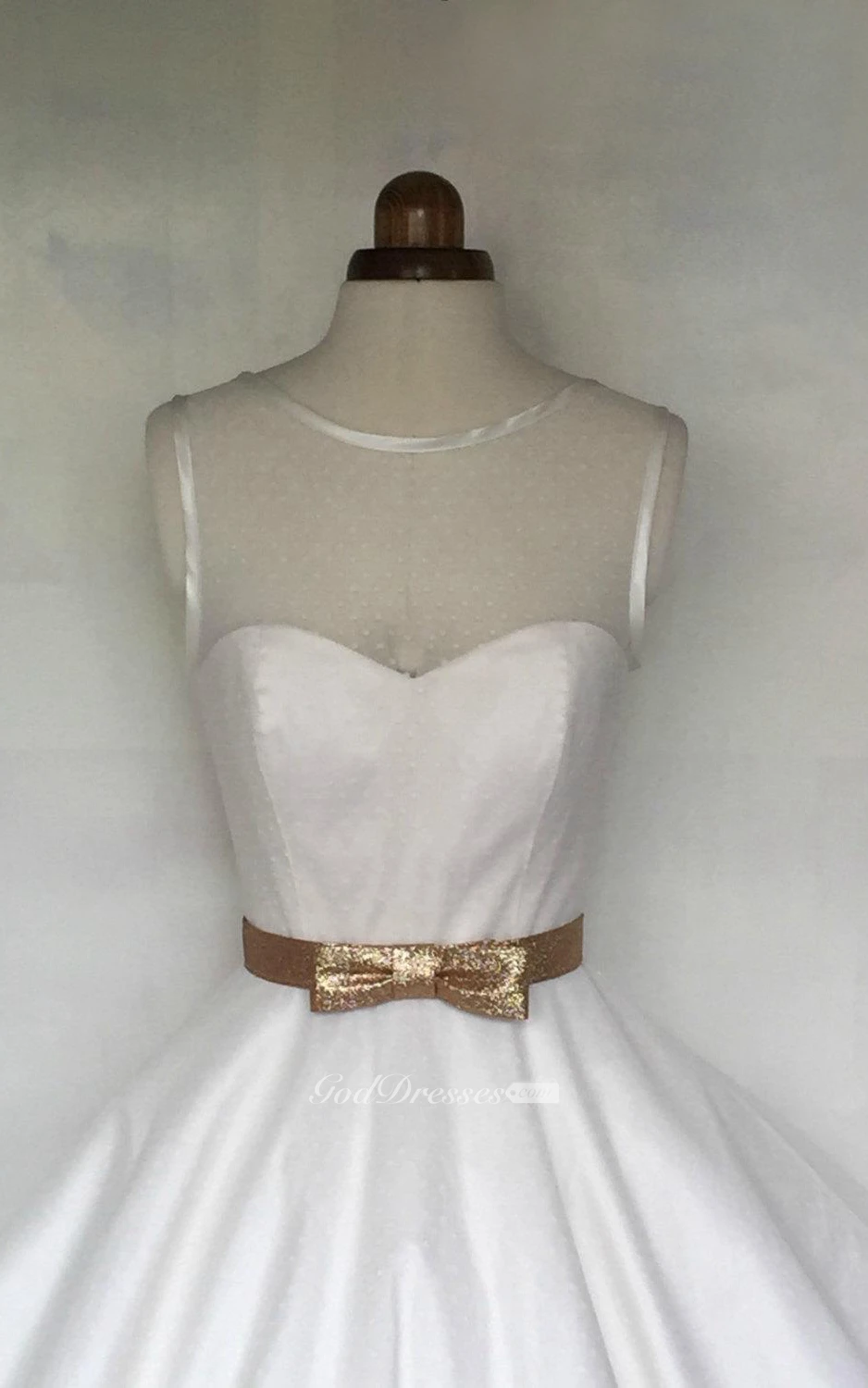 A-Line Tea Length Jewel Neck Dress With Bow Sash and Illusion Top