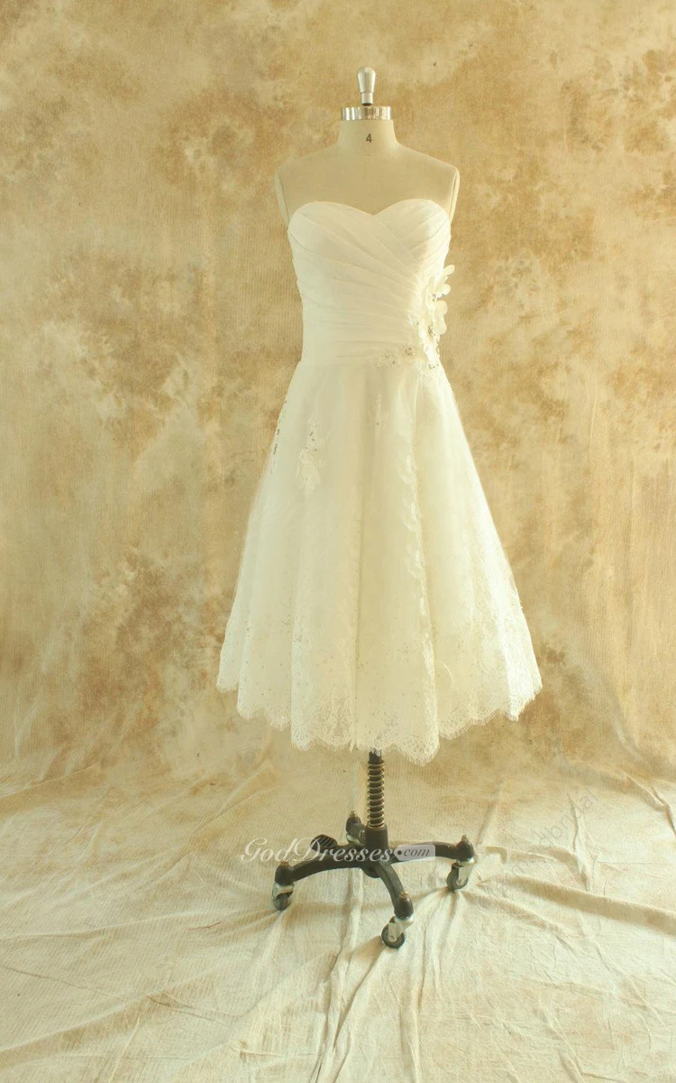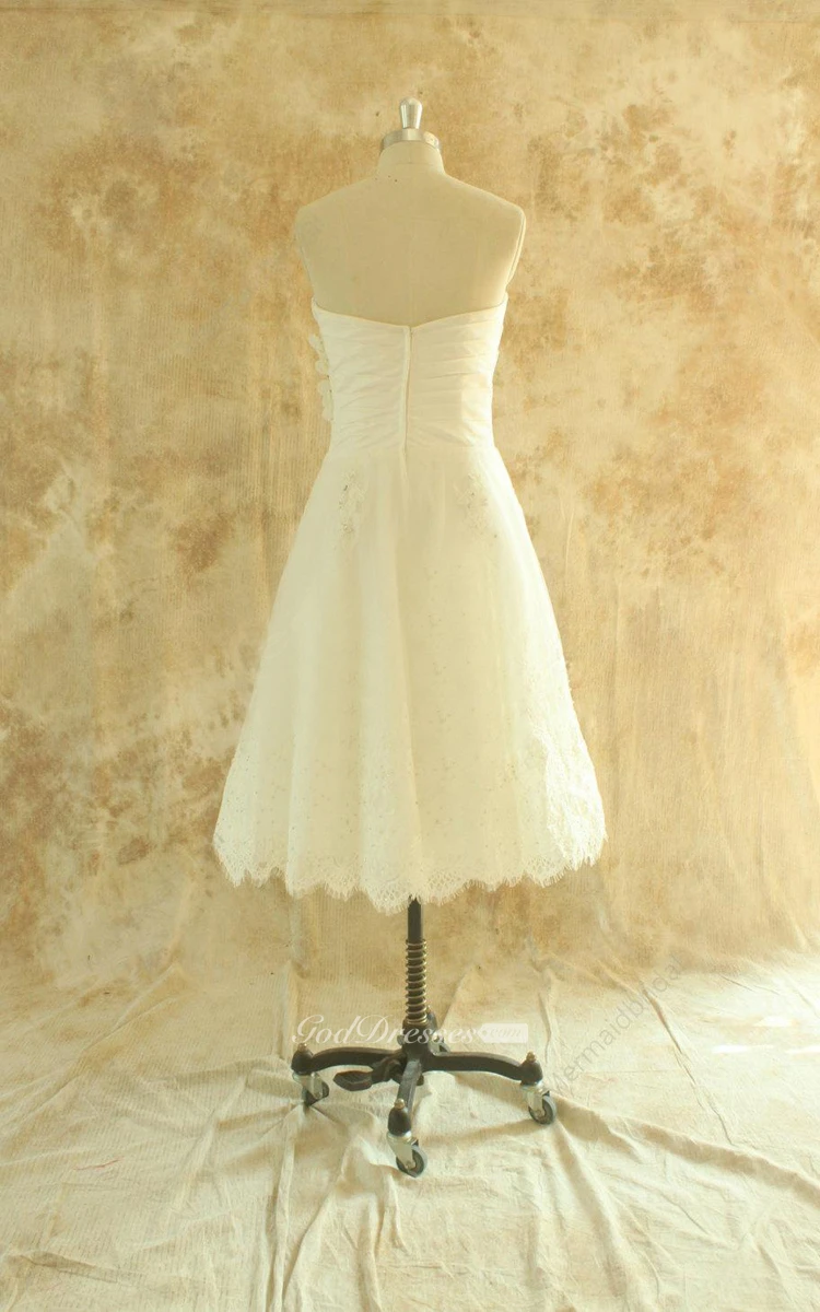 A-Line Tea-Length Lace Wedding Dress With Ruching And Sweetheart Neck