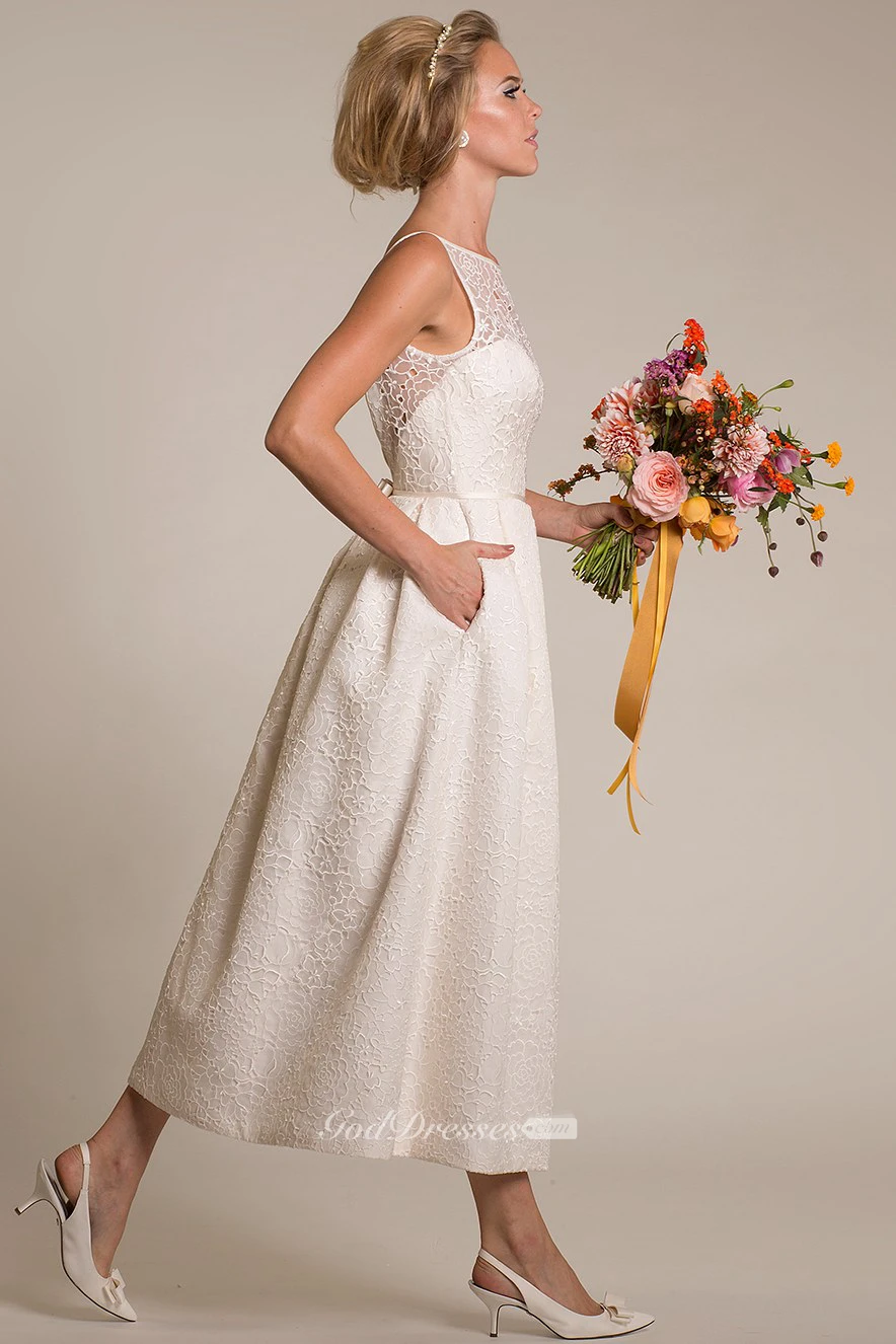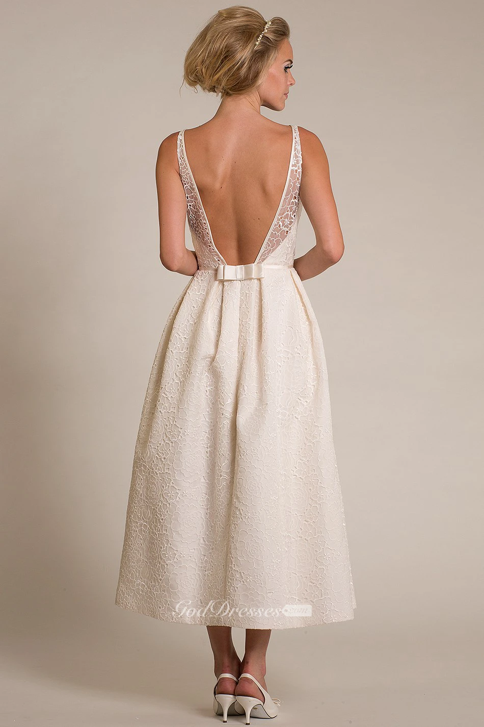 A-Line Tea-Length Sleeveless Bateau-Neck Lace Wedding Dress With Deep-V Back